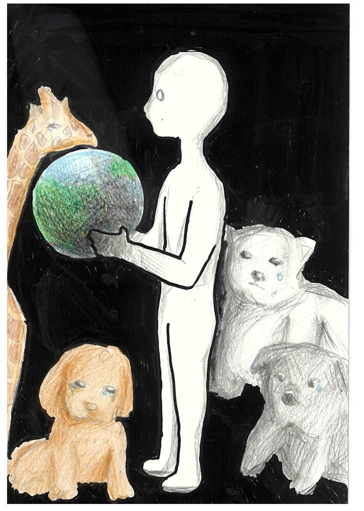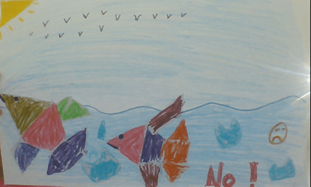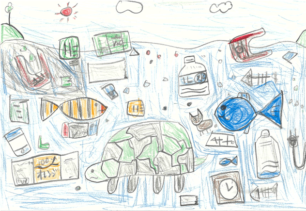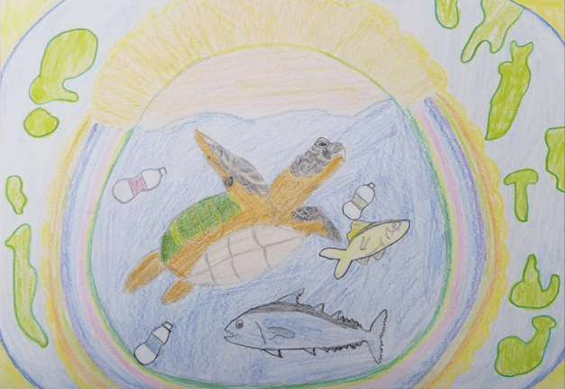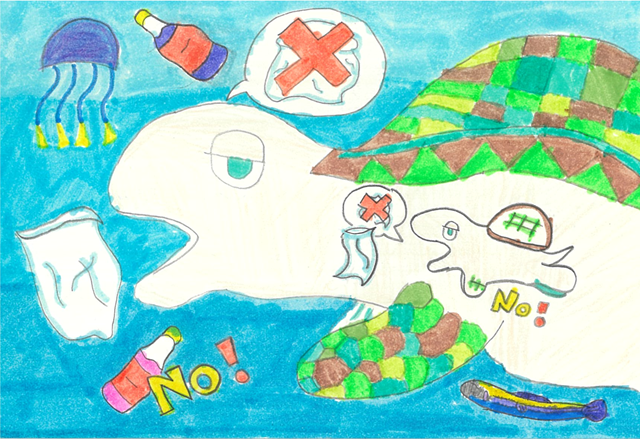 Today, we are losing many living things because of the waste plastic that humans throw into the sea and rivers. I drew this picture because I wanted to cleanup volunteer to save many animals from this loveless behavior.