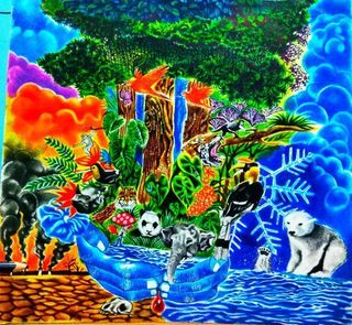Environmental degradation is one of the largest threats that are being looked at in the world today. The United Nations International Strategy for Disaster Reduction characterizes environmental degradation as the lessening of the limit of the earth to meet social and environmental destinations and needs. Ban ki moon rightly said : “Saving our planet, lifting people out of poverty, advancing economic growth… these are one and the same fight. We must connect the dots between climate change, water scarcity, energy shortages, global health, food security and women’s empowerment. Solutions to one problem must be solutions for all.” In my artwork I’ve depicted how the lives of the animals are getting affected due to environmental degradation. With an increase in the number of Industries and factories, there is also an increase in the level of pollution which is one of the main reasons behind global warming. Due to global warming the the glaciers at both the poles have started to melt which has resulted into ‘ Habitat Crisis ‘ for the animals like Polar Bears etc. The hands in my painting represent hope… The hope of a brighter future where all the animals could live in harmony. In my artwork I’ve tried to focuss on such aspects .