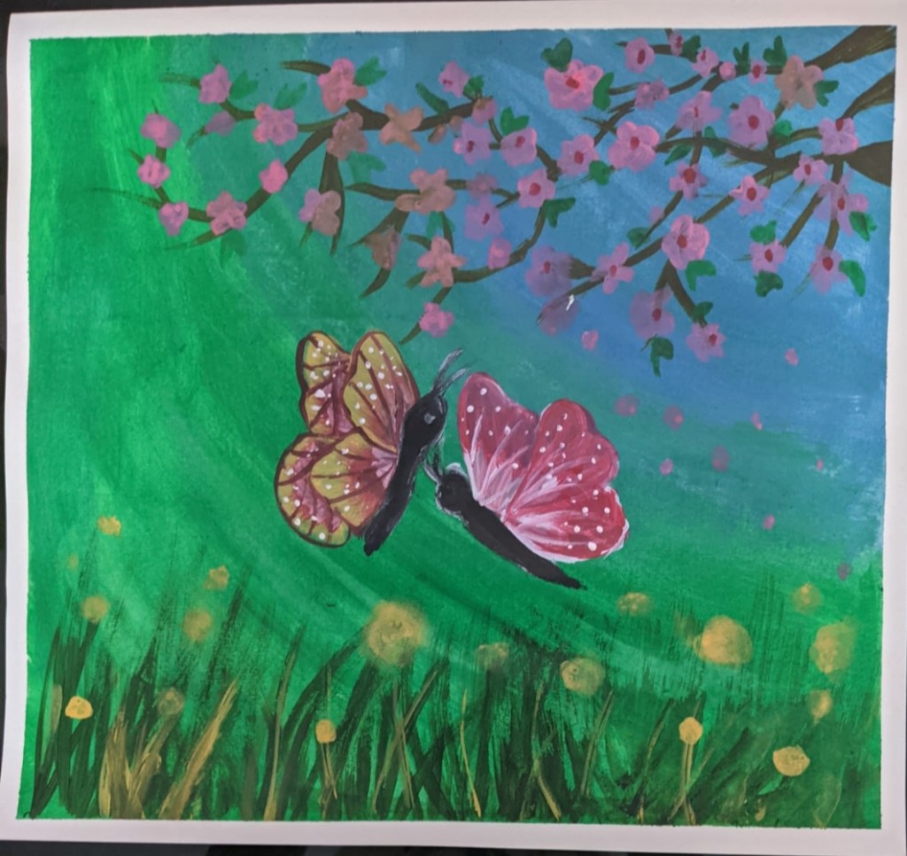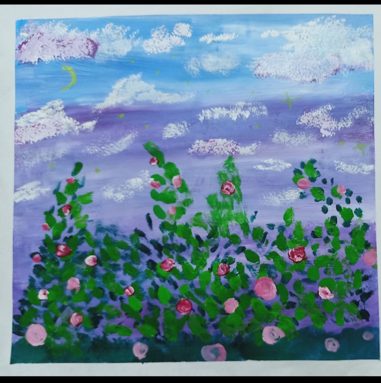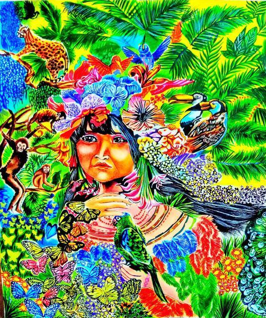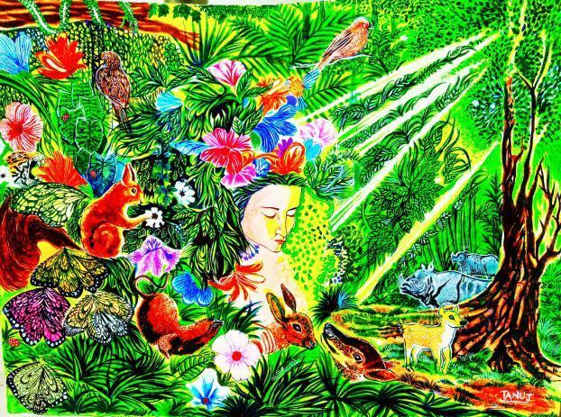I have shown the love and care of mother nature. You can spot the tiger to the very left side of this painting. The rhinos to the right ,the cute fawn to the right. Some beautiful butterflies at the bottom left corner of the artwork. You may notice the two birds at the top and a humming bird sucking nectar from the beautiful flowers. You may also see the fawn and the mother deer at the centre of this painting. Mother Nature in her human form has taken the Central stage in my painting. You can also see the beautiful flowers in the garden- so vibrant they are!!! I have painted many other creatures in my artwork(I’ll let the judges find the other creatures)😁😁.I believe that this painting is apt for the current situation in which we all are witnessing the large scale devastation of the flora and fauna the sole responsibility of which goes to the exploitative character of modern technology and the greedy mindset of the humans. n nI have made my best efforts to put my imagination on paper and make an explosion of mother nature’s and wildlife’s colours and motifs. I have used bright colours to create this artwork so as to express the vibrancy of the earth’s natural diversity in wildlife and to showcase the harmony and euphony among the animals living togethter in the environment.