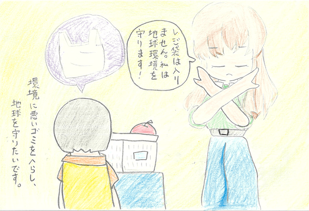 I don’t need a plastic shopping bag. I will protect the global environment!” I want to protect the earth by removing environmentally unfriendly garbage.