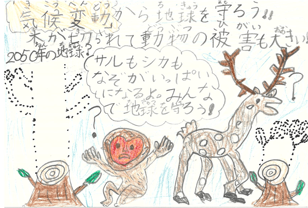 Earth in 2050? Protect the Earth from climate change!! Trees are cut that causes great damages to animals! Both monkeys and deer have full of questions. Let’s protect the earth together!