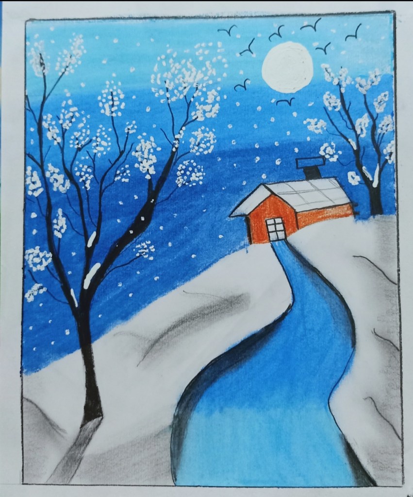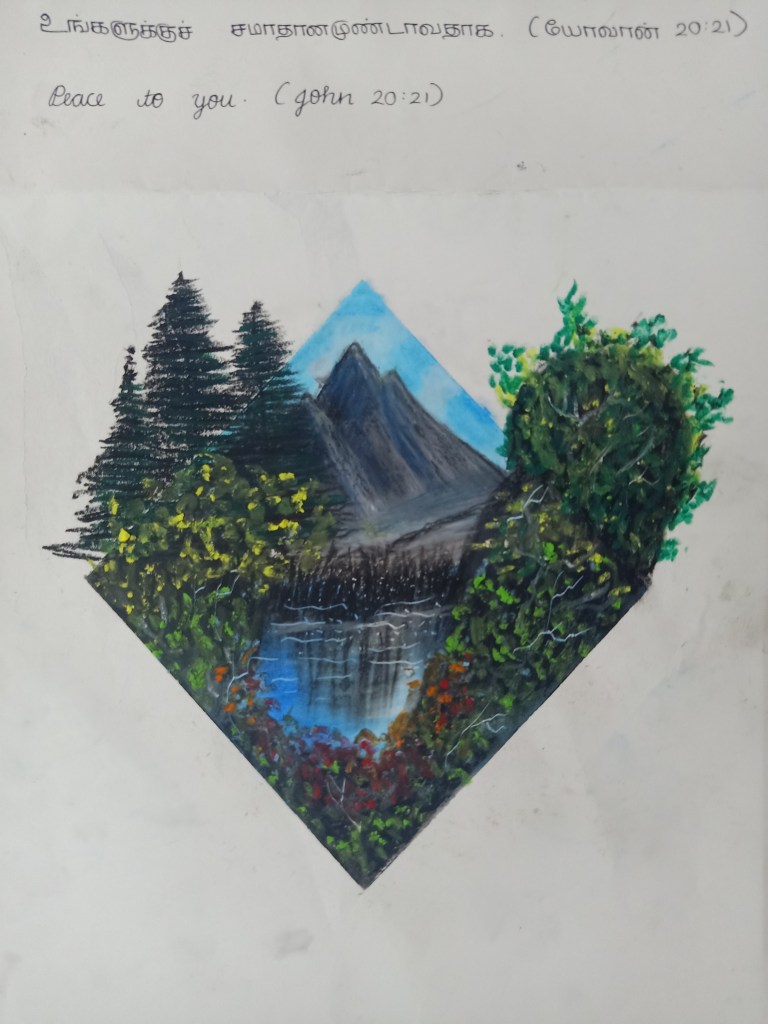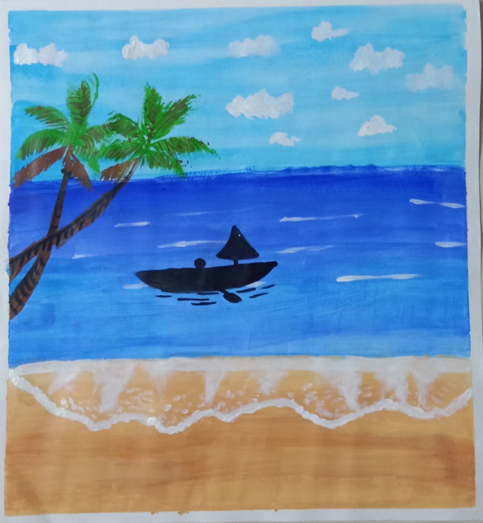 I’ve depicted the scene where mother nature is calling out all the humans for a better future. Here mother has taken the form of a ocean goddess . You will be able to spot beautiful oceanic creatures and mermaids and corals embellishing her hair and her crown. The rising sun in the background symbolises the dawn of a brighter future full of new hopes . I’ve basically tried to create awareness through my painting regarding the conversation of the environment. The rising sun in the background and the blowing of the conch symbolises a new beginning…. The beginning of a brighter future where all the humans would strive to protect and preserve the earth and it’s elements.