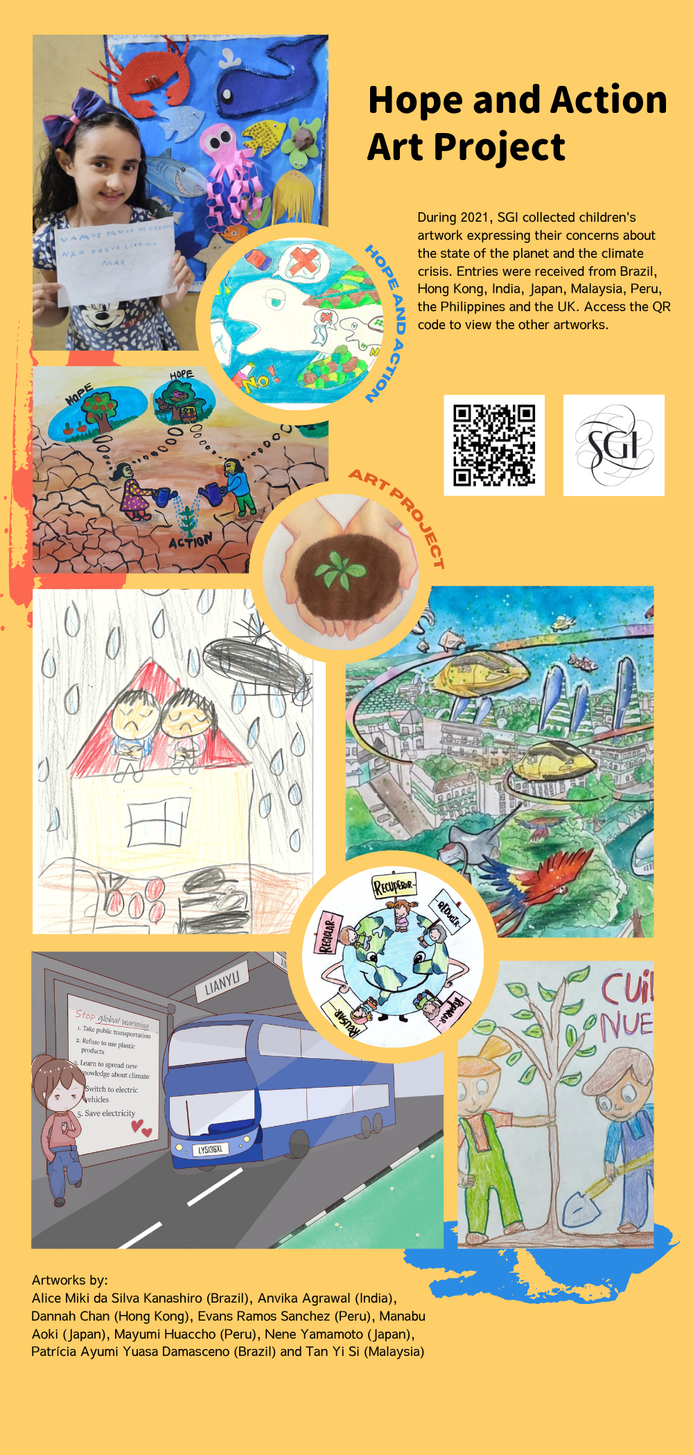 During 2021, Soka Gakkai Peace Committee collected children’s artwork expressing their concerns about the state of the planet and the climate crisis. Entries were received from Brazil, Hong Kong, Japan, Malaysia, Philippines, India, Peru and the UK. We present the artworks at our event commemorating the 26th UN Climate Change Conference of the Parties (COP26) in the UK.